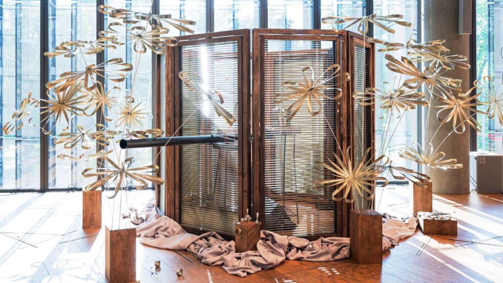 Re-Use: Der wertschätzende und freie Umgang mit Material, mit Dingen die wir Menschen produziert haben und die nur allzu schnell auf dem Müll landen, war das Hauptthema bei der Materialwahl dieses Bühnenbildes. Ein Abbruchhaus voller funktionstüchtiger, faszinierender Jalousien. Die Lamellen, die mit ein paar Schnüren, einem Stab und noch ein wenig Mechanik eine Jalousie bilden, hat die Architektin mit Kindern gemeinsam erforscht und zu allen möglichen Dingen wie Blättern, Blumen, Zaun, Vögeln u.v.m. werden lassen.