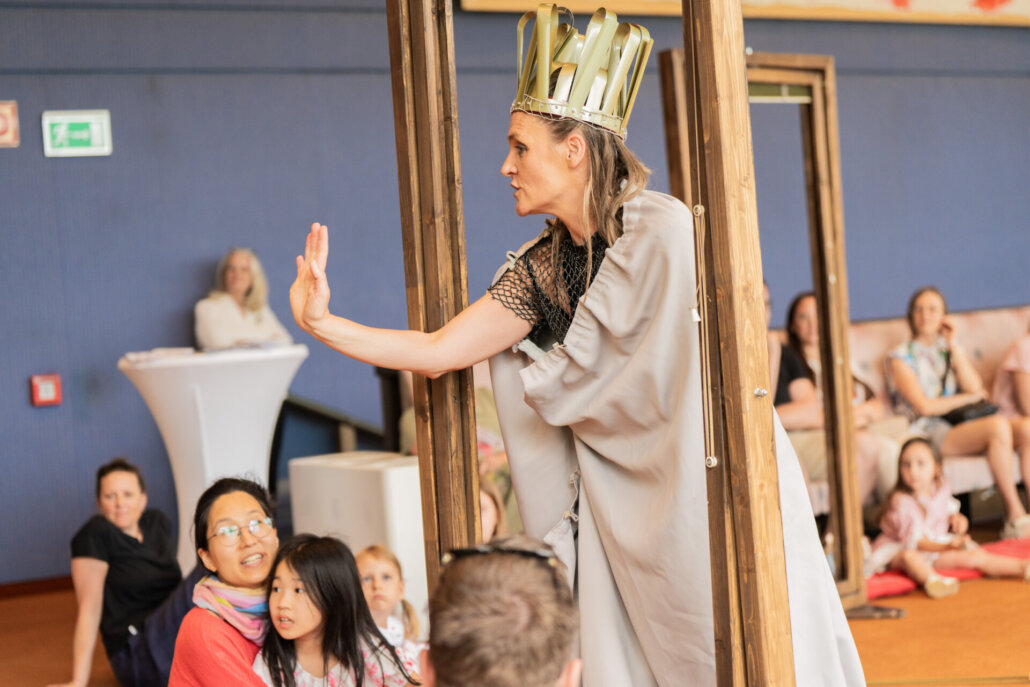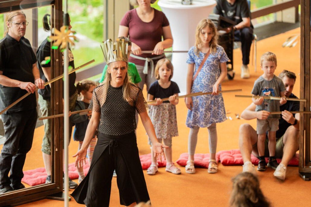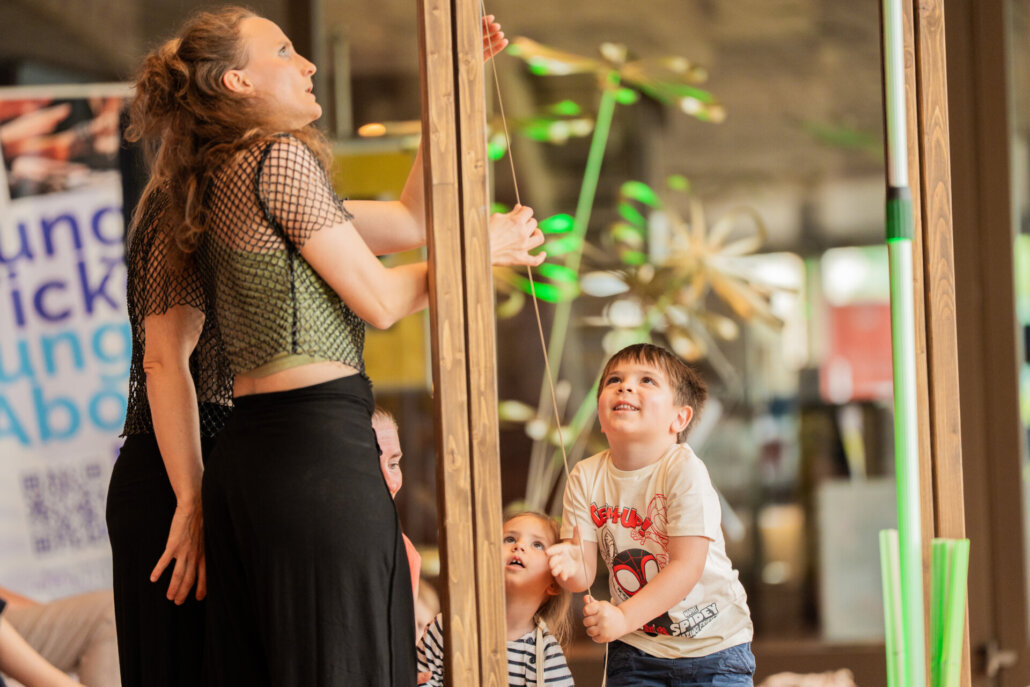 Das modulare Bühnenbild, als Baumhaus Ausgangspunkt des Stückes, wird zum „Trumm“ und schließlich mit Hilfe des Publikums zum Schloss. Kinder – Meister der Verwandlung und kreative Geschöpfe im Bau von fantastischen Spielwelten, packen gemeinsam mit an. Sie erschaffen sich eine Welt, die ihren Vorstellungen entspricht und werden gehört. Ist es nur ein Traum – oder vielleicht doch wahrhaftig, was sie zu bewegen im Stande sind? Da ist Magie im Spiel!
